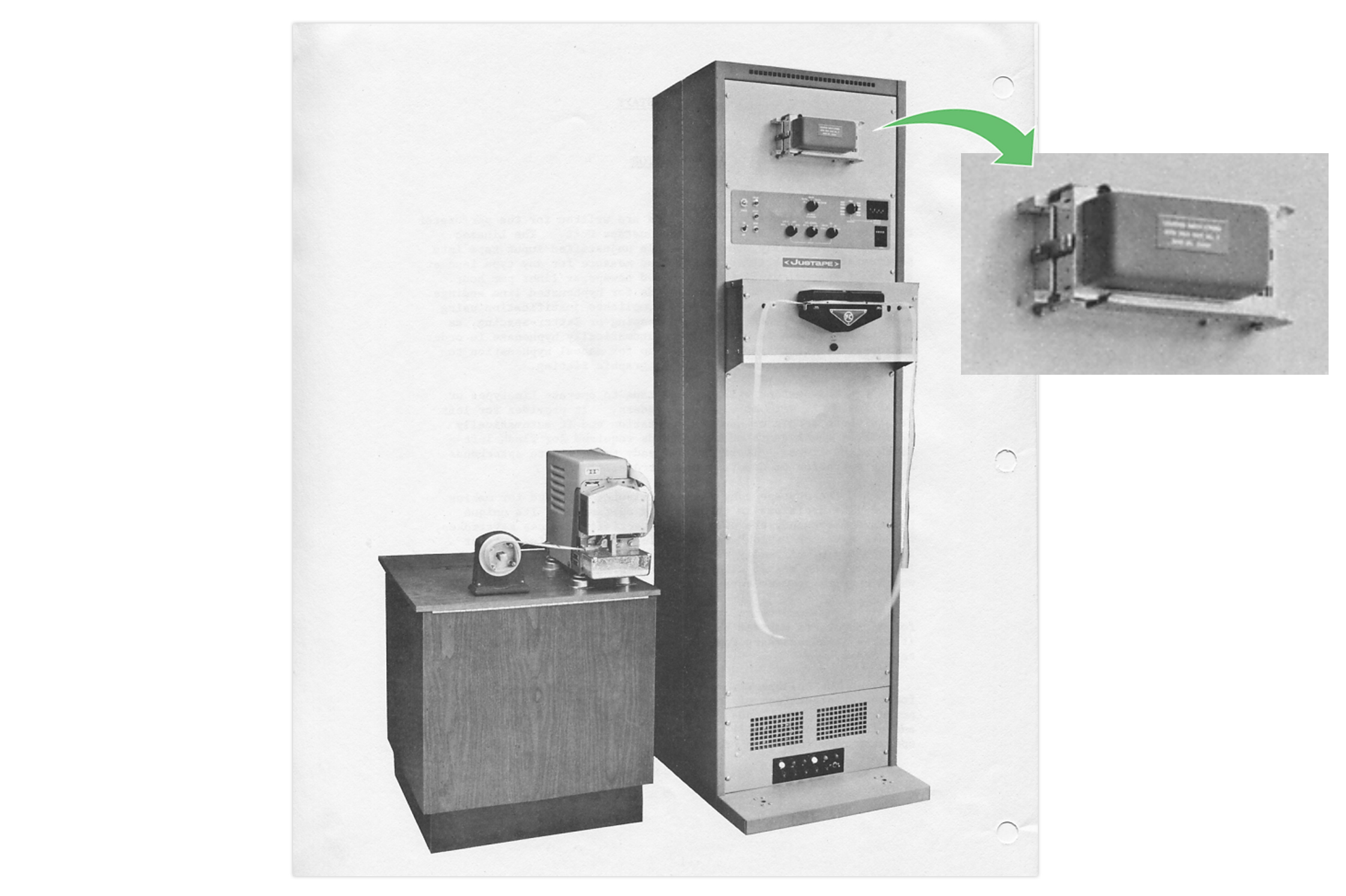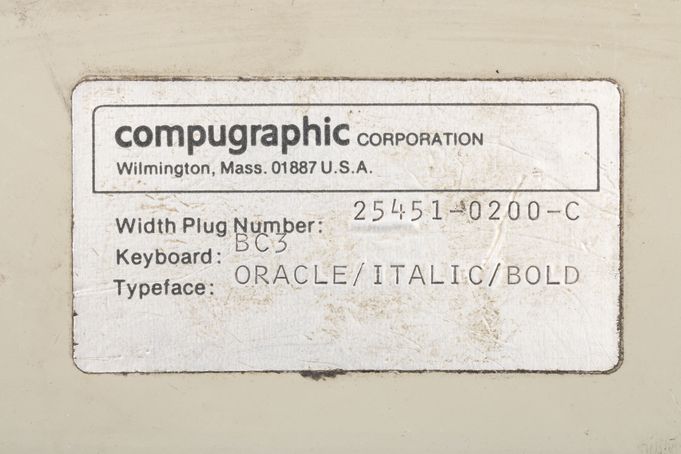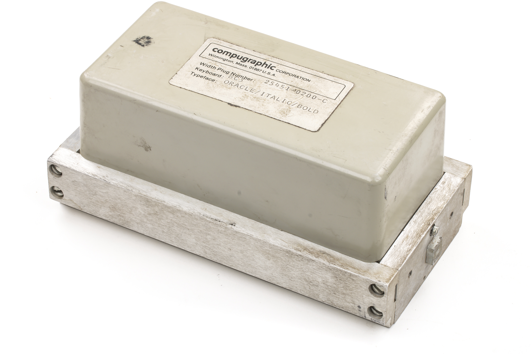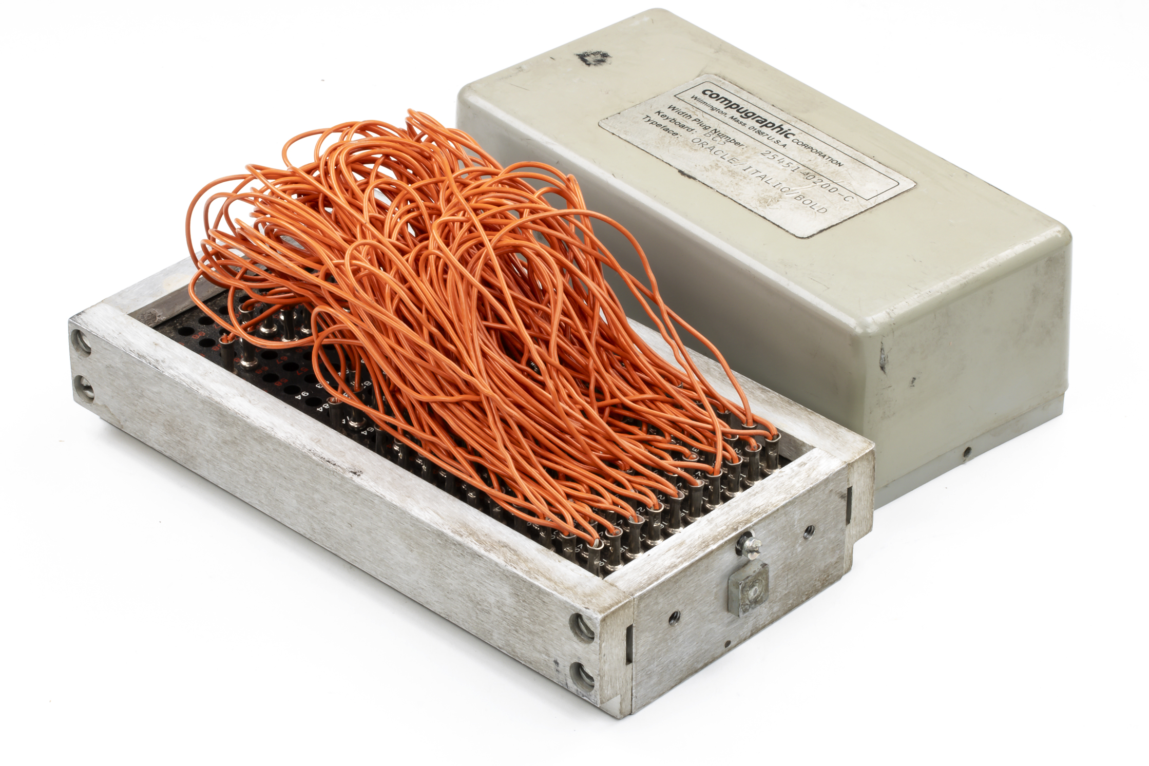 Stores the character widths used to control letter spacing for punched tape driven typesetters like Linotype, Intertype or Compugraphics. Text to be typeset was entered on a keyboard and stored on punched tape. The Justape machine could take the unjustified text from that tape, justify it using the character spacing information on the width plug and write it to a second tape, which was then fed into the typesetter.