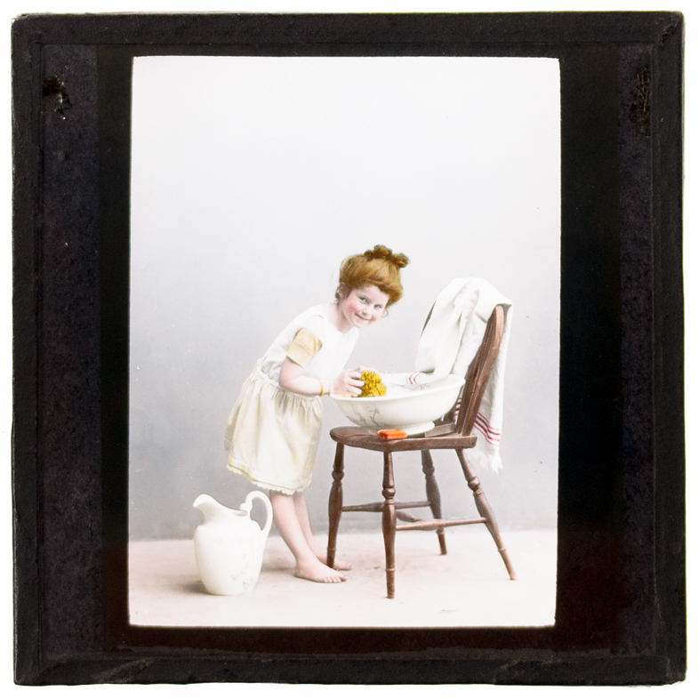 A black & white photographic magic lantern slide tinted by hand. (Date estimate based on hairstyle.)