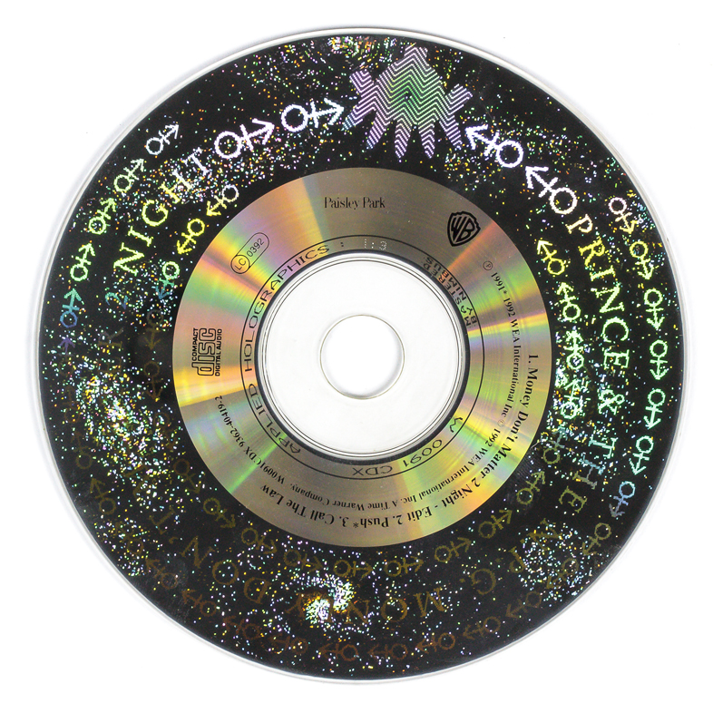 Audio on a CD-single-sized inner track with the rest of the surface holding iridescent ("holographic") graphics.