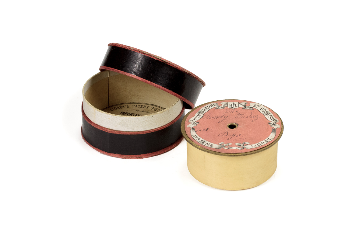 A molded celluloid cylinder on a brass core that could only be played on Lioret phonographs.