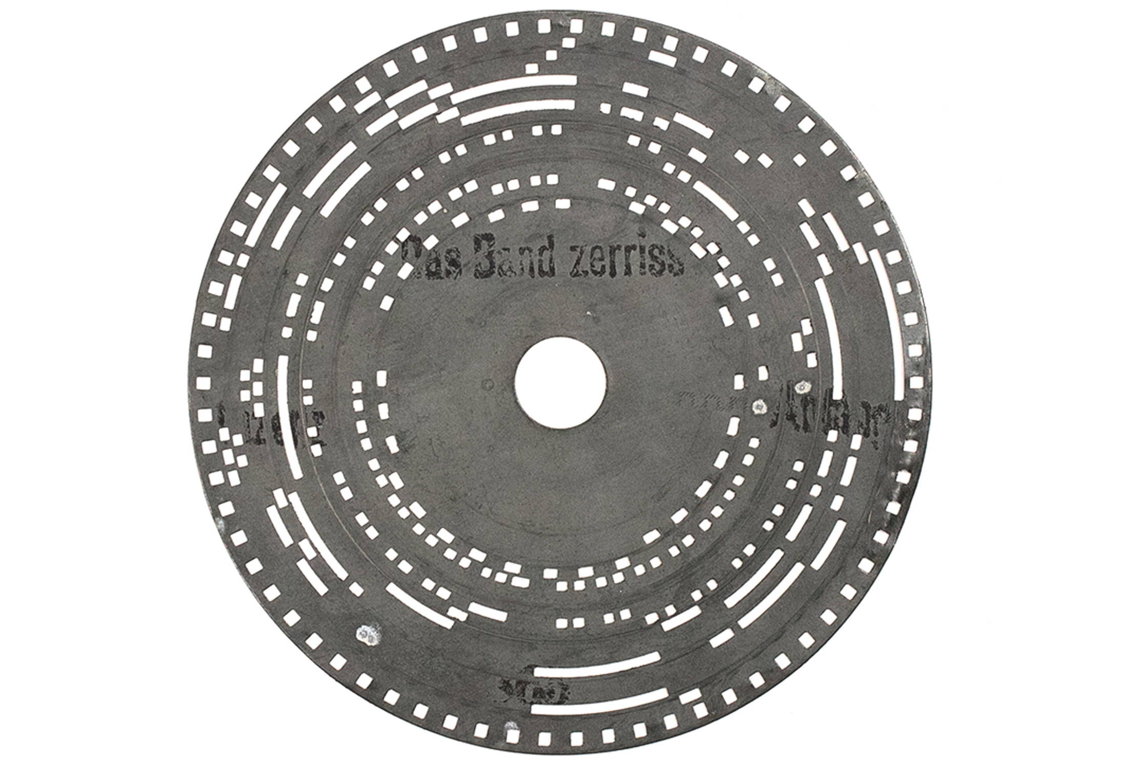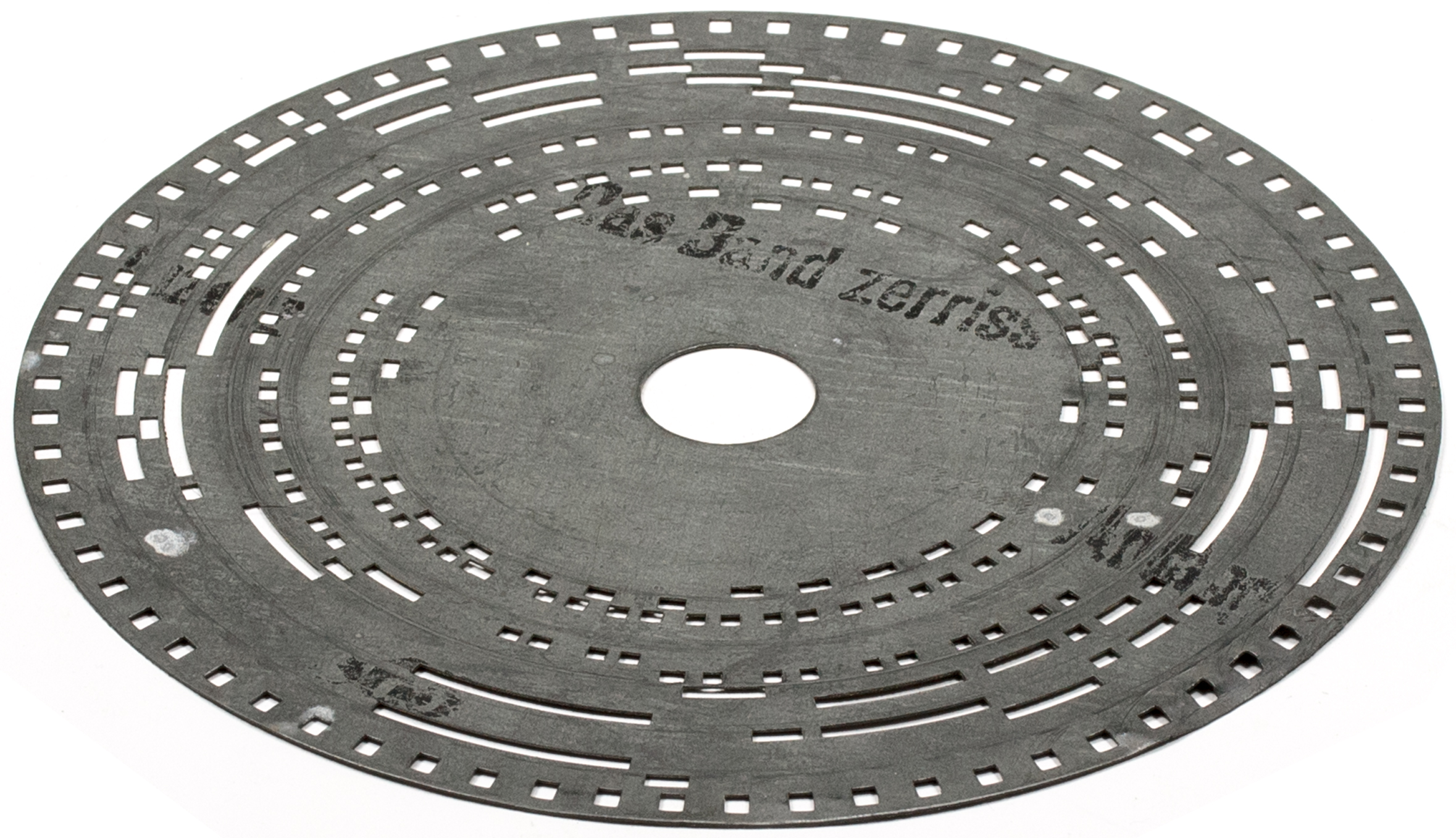 A zinc disc for the 14-note Organette Diane. Turned by a toothed gear that engaged the holes around the outer edge.