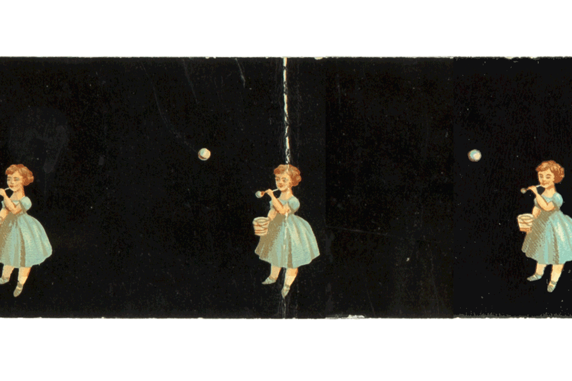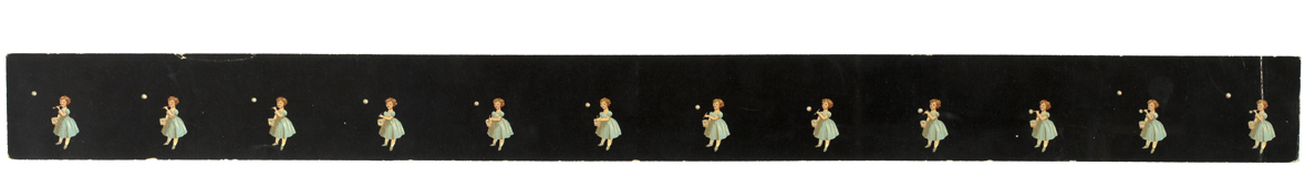 The moving figure is viewed through a glass in which an illustration of a stage and scenery is reflected. The reflection is only visible against the black background of the strip, so the figure appears to be in the foreground and the scenery in the background, as shown here.