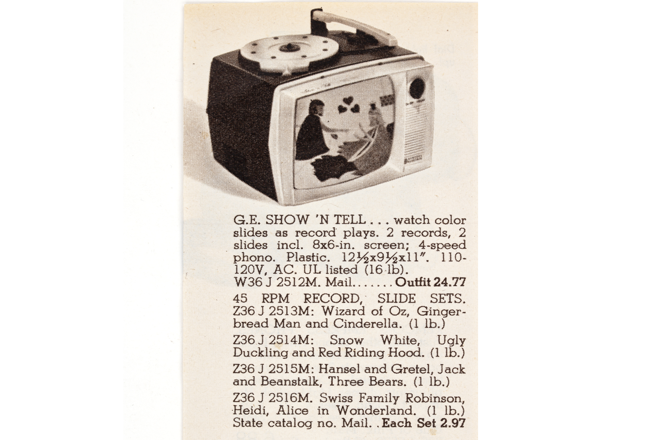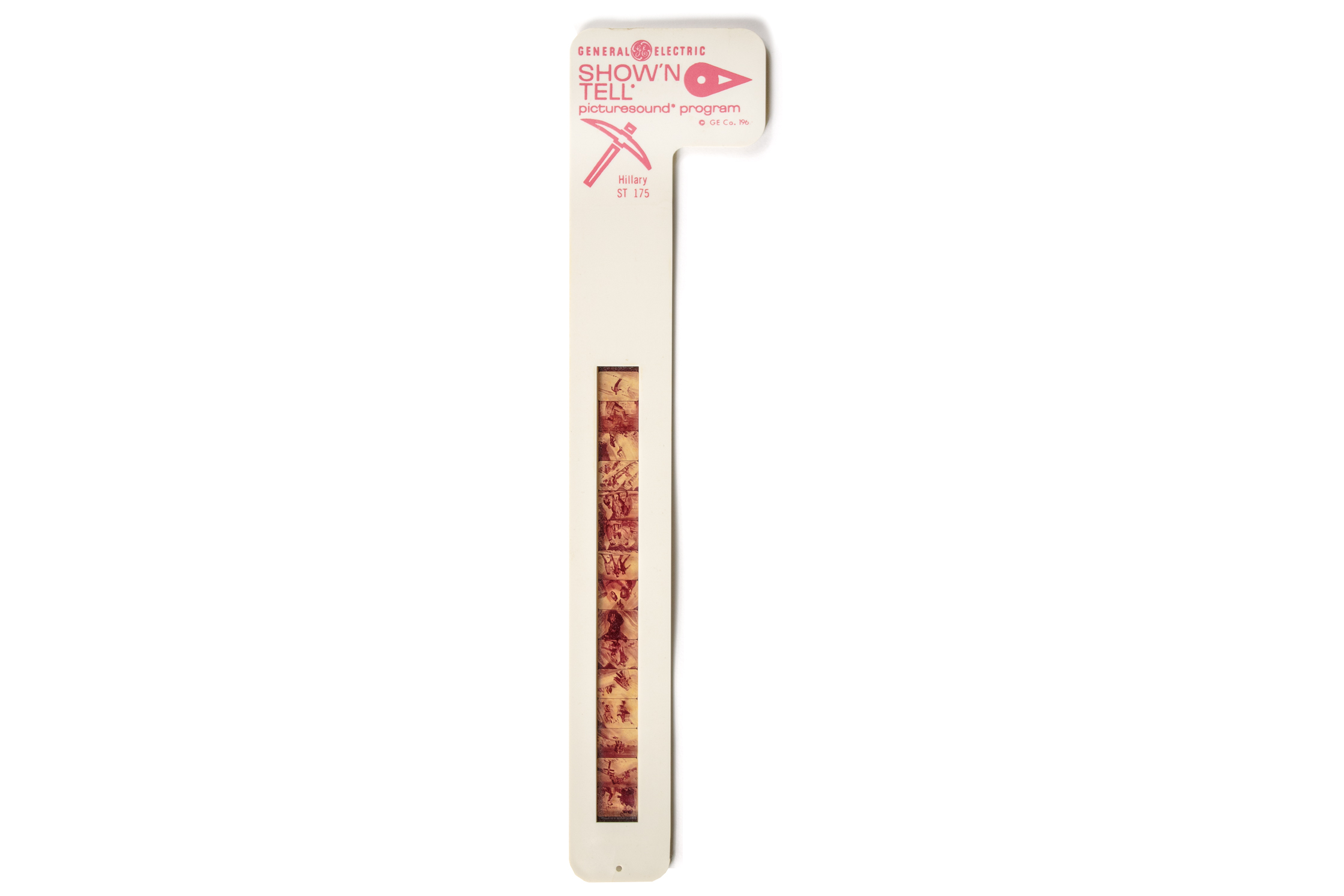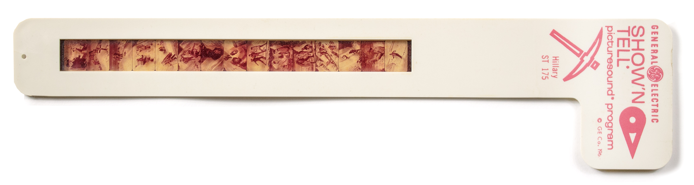 The pictures are on 16 mm film in a cardboard mount. Audio is on a 7 in. 33⅓ rpm vinyl record.