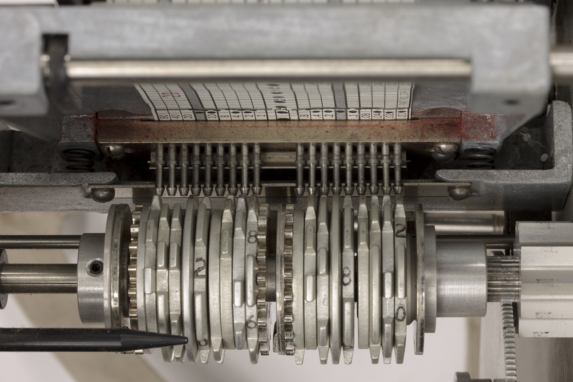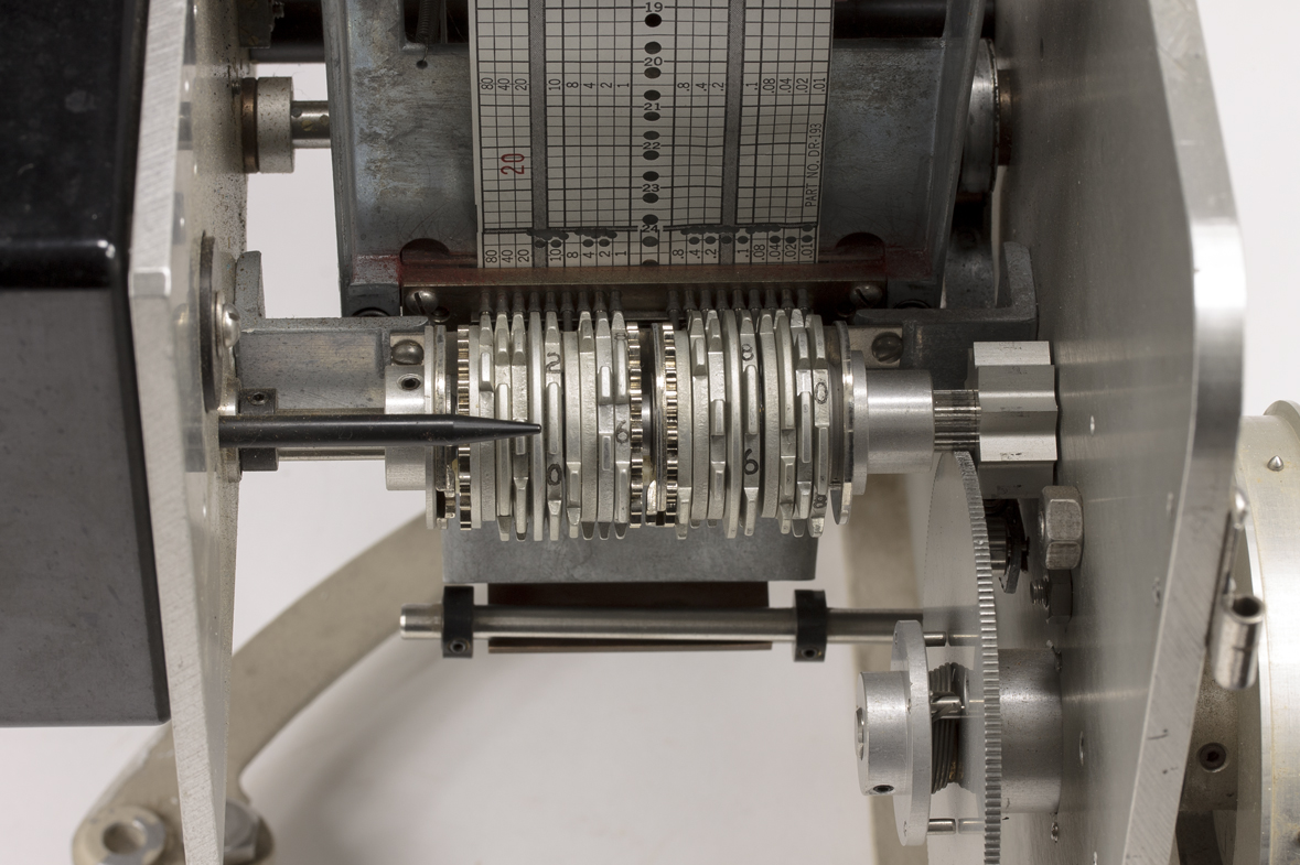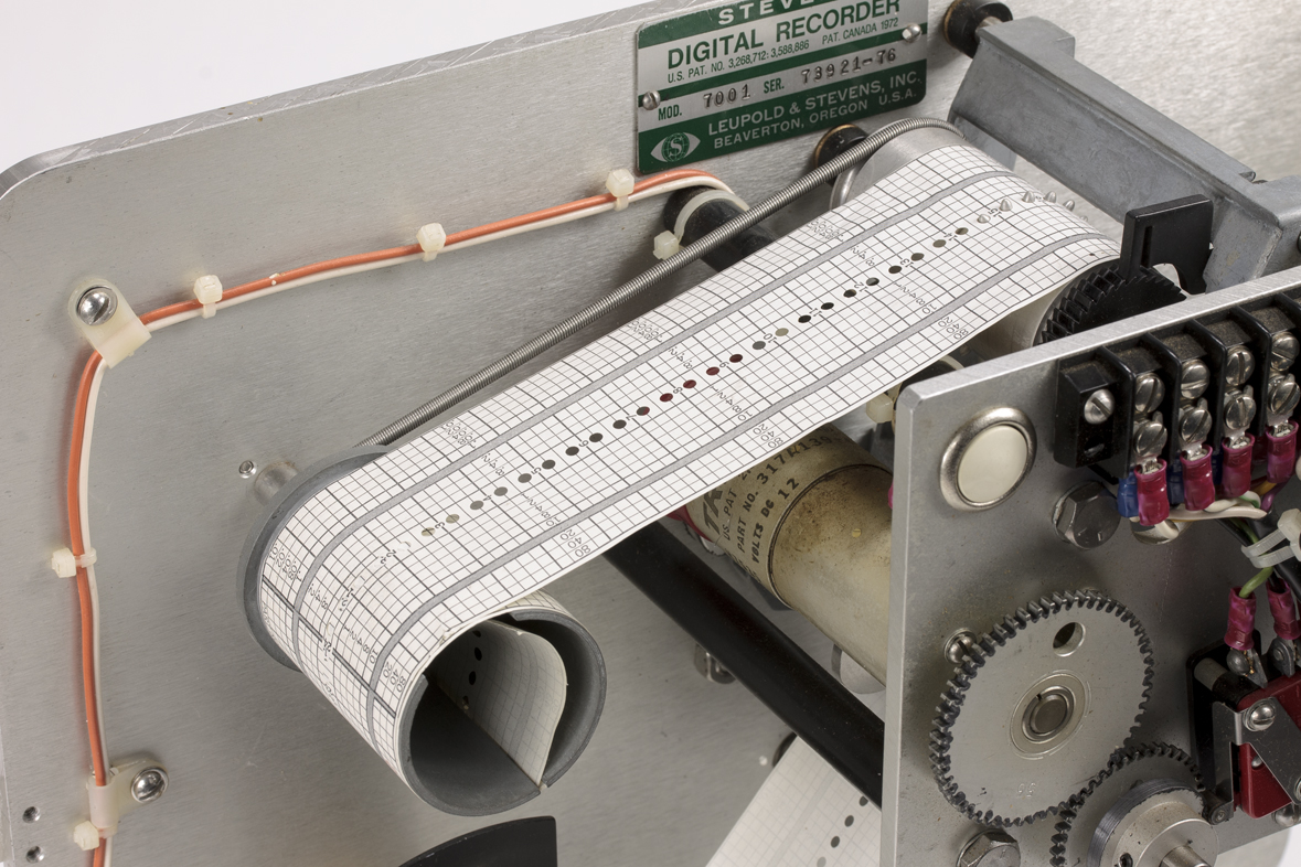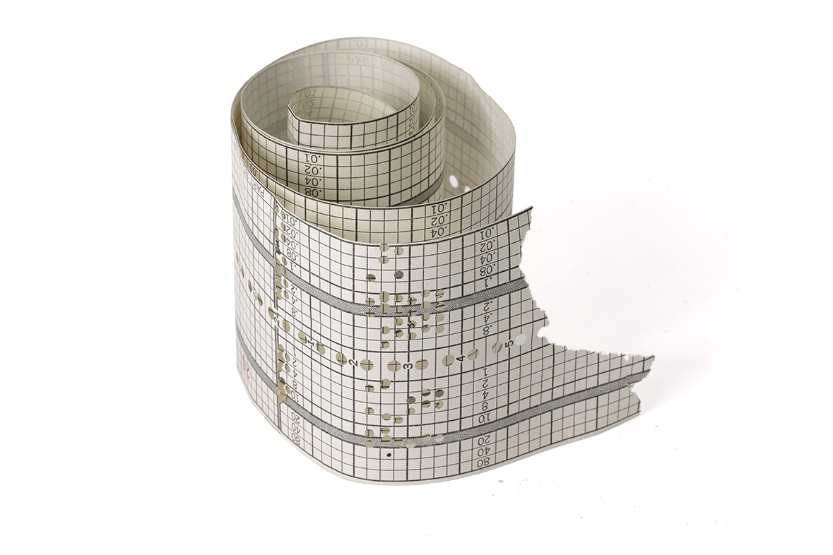 A 16-channel punched tape used to record water levels measured by the electromechanical Stevens 7001. A separate tape reader was used to transfer the data to a computer file.